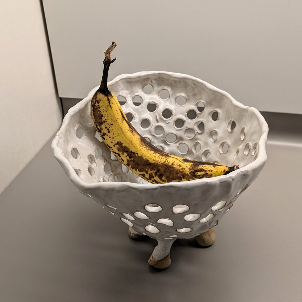 When it comes to objects, it's always intriguing when a familiar form is developed and produced in another way, with another material. In this case, a colander, usually found in metal or plastic, is produced in clay. Inspired by the colander from her Aunt, Sara Mills, first ceramic collection in the 1970's, it was created to solve a number of personal needs. Working with speed and zero waste, Arabella first forms a pinch pot with the days excess clay and then she gets punching. The holes and thus colander originated from what was a bowl because her first studio charged by the weight of the finished item; having holes made the bowls about 40-50% lighter. The result all summed up to a weird, organic, creature-like clay colander with feet, every one being totally unique. As you can see,