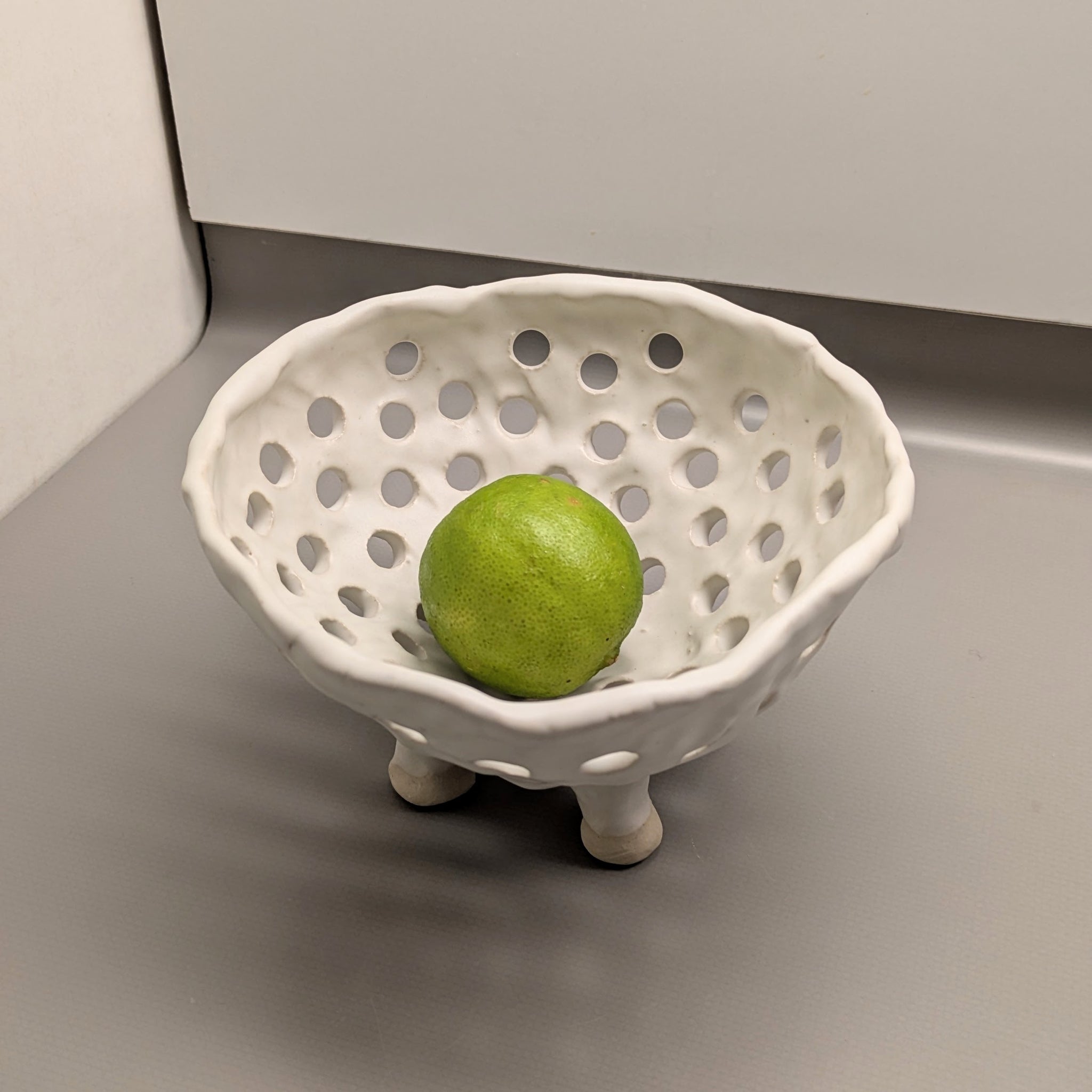 When it comes to objects, it's always intriguing when a familiar form is developed and produced in another way, with another material. In this case, a colander, usually found in metal or plastic, is produced in clay. Inspired by the colander from her Aunt, Sara Mills, first ceramic collection in the 1970's, it was created to solve a number of personal needs. Working with speed and zero waste, Arabella first forms a pinch pot with the days excess clay and then she gets punching. The holes and thus colander originated from what was a bowl because her first studio charged by the weight of the finished item; having holes made the bowls about 40-50% lighter. The result all summed up to a weird, organic, creature-like clay colander with feet, every one being totally unique. As you can see,